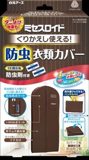 ■【説明】:スーツ・コート・ワンピースが1〜2着入り、折りたたんで持ち運びもできる衣類収納用カバーと無香タイプの防虫剤のセットです。4つの機能※で衣類を守ります。カバー内のダニよけ効果付き。防虫剤を取り替えてくり返し使えます。※防虫・消臭・防カビ・黄ばみ防止