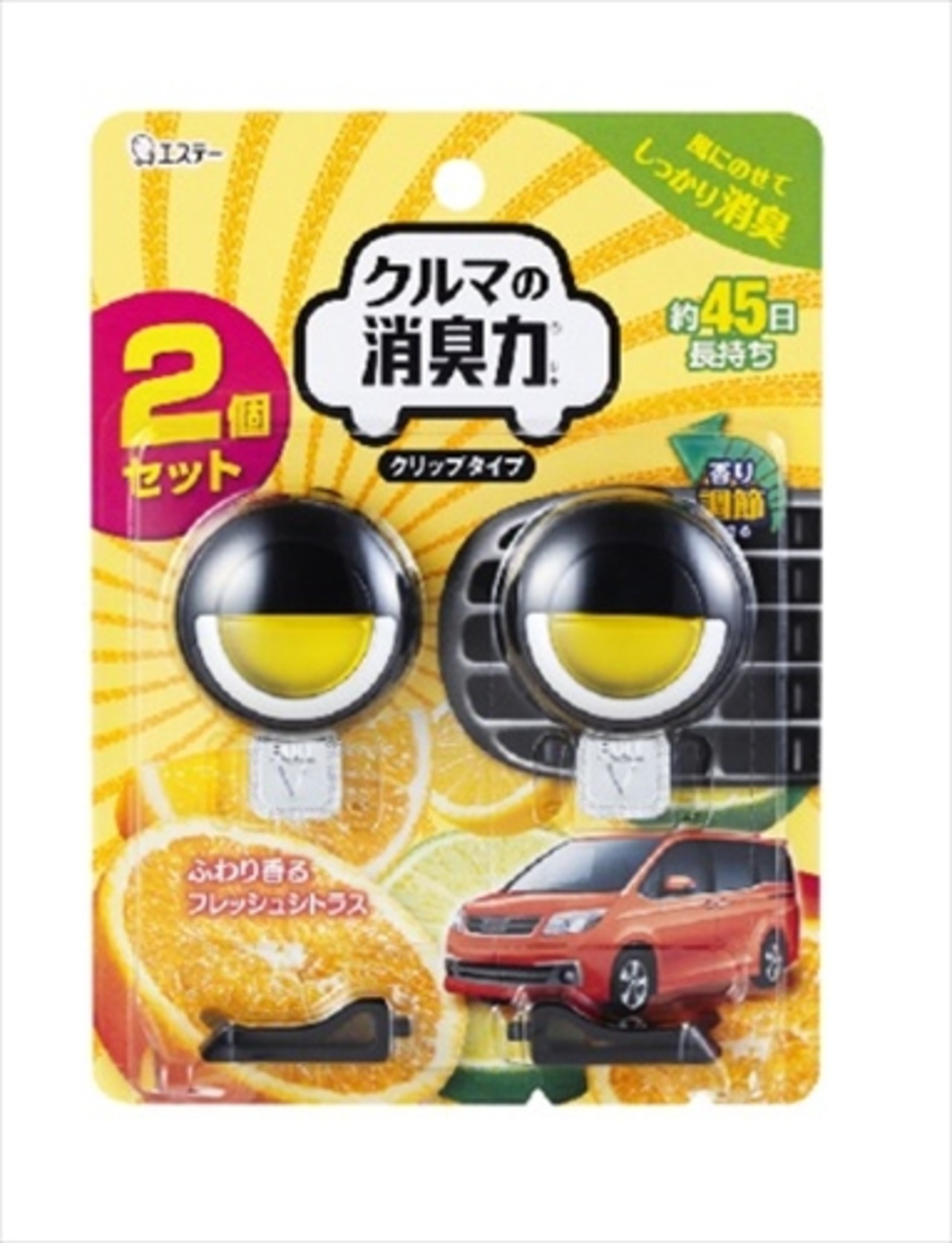 ■【説明】:クリップ本体が香り車内を消臭、快適な空間にします。エアコンの吹き出し口に取り付けるだけで簡単。香り感溢れるクリップのヘッドシールが吹き出し口のアクセント(デコ)になり、視覚的にも香りを楽しめます。使用期間目安は約30日(1回の使用量2個の場合)(季節や使用状況により異なります)。