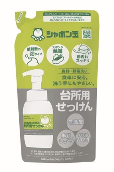 ■【説明】:台所用せっけんとして史上初の泡タイプです。詰まり・液だれしにくい新ボトルを採用しました。。手肌にやさしく、油汚れやニオイをしっかり落とします。すぐれたすすぎ性で泡切れがスッキリ。昔ながらの釜炊き熟成製法で作られた、香料、着色料、合成界面活性剤不使用の無添加せっけんです。スポンジ除菌も致します。