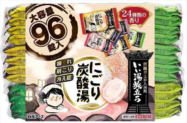 ■【説明】:ご自宅のお風呂で毎日にごり湯の温泉気分を楽しめる96錠入のアソートパック。24種類の風情漂う香りが日替わりで楽しめます。炭酸ガスが温浴効果を高め血行を促進し一日の疲れをやわらげます。