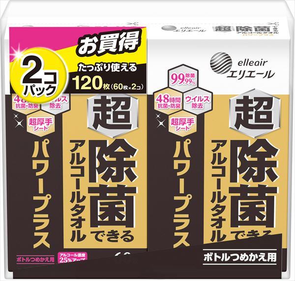 【まとめ買い】エリエール 超除菌できるアルコールタオル パワープラス ボトルつめかえ用60枚2個パック【HRM-22567595-1】×12点セット