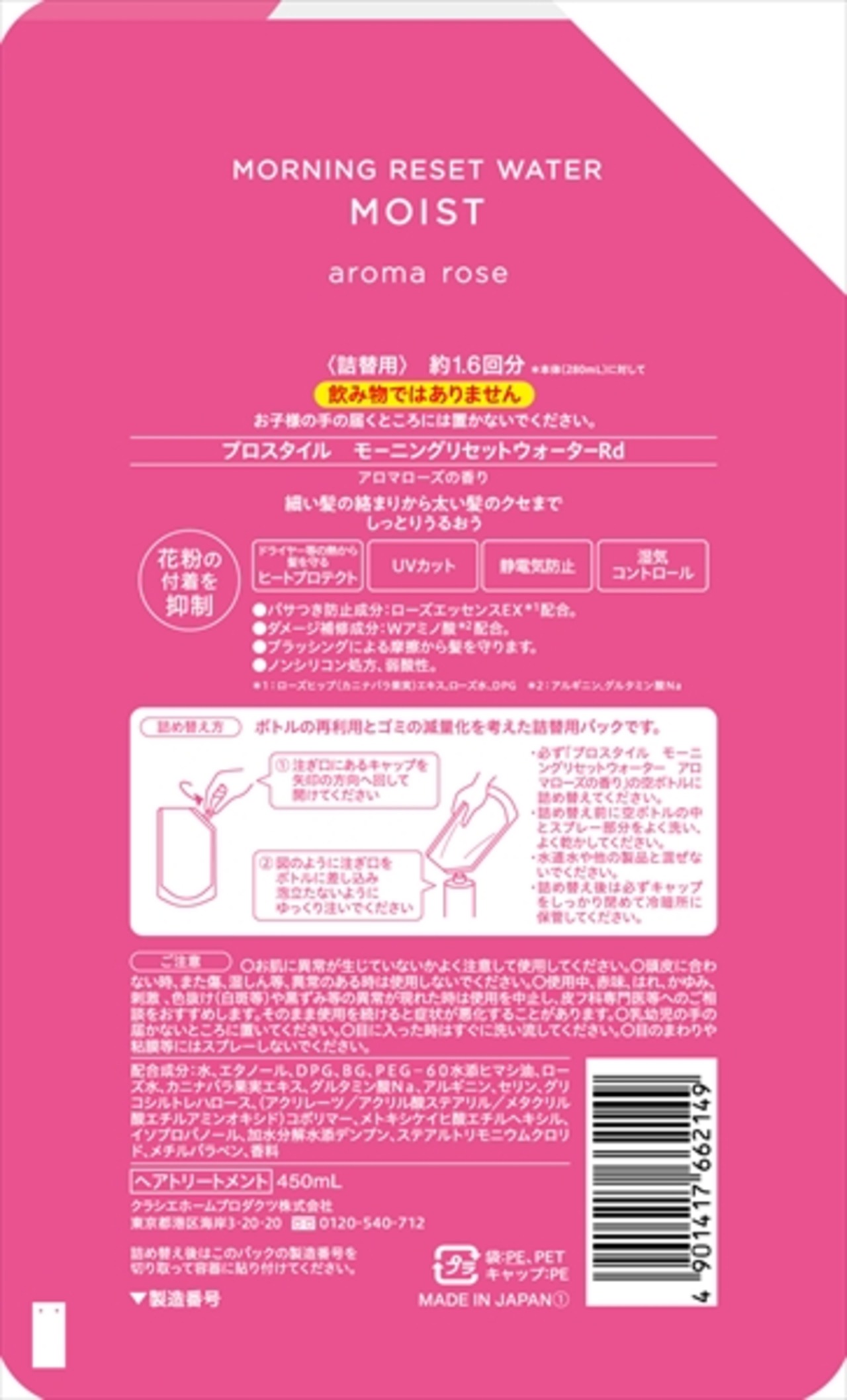 ■【説明】:●細い髪の絡まりから太い髪のクセ・ハネまでしっかりリセットしてしっとりうるおう●花粉の付着を抑制し、外出も快適●ヒートコート、UVカット、静電気防止、湿気コントロール●パサつき防止成分:ローズエッセンスEX配合●ダメージ補修成分:Wアミノ酸配合●ブラッシングによる摩擦から髪を守ります