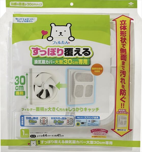 ■【説明】:すっぽり覆える換気扇カバ−大型30センチ専用。取付簡単。羽根の直径30センチ専用。換気扇を油汚れから守る。すっぽり覆えるタイプで側面まで汚れをカバー。プロペラ直径30センチにピッタリのサイズ。白壁や機器になじみやすいオフホワイト色。