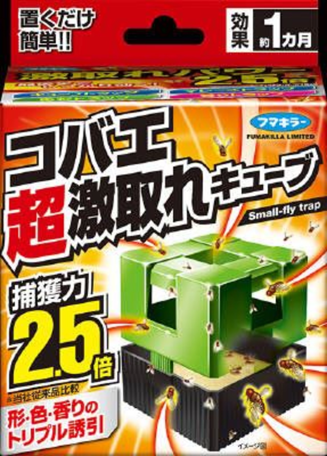■【説明】:●コバエを視覚的に誘引するキューブ型。●コバエが好む緑と黒のツートンカラー。●コバエの好きな酢と酒にアミノ調味料を加えた特選誘引剤で強力誘引。