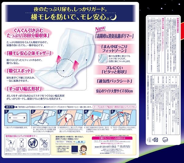 ■【説明】:たっぷり8回分をぐんぐん吸収するので、尿量の多い方でも一晩中安心な尿とりパッドです。