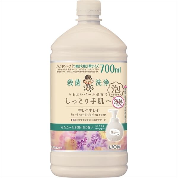 ■【説明】:殺菌・洗浄+うるおいベール処方でしっとり手肌へ。きちんと殺菌してバイ菌から手肌を守りながら、「うるおいベール」が手洗い後も手肌にとどまる、泡タイプのキレイキレイ薬用ハンドコンディショニングソープ。●石けん成分を従来品*の1.6倍配合。*キレイキレイ薬用泡ハンドソープ●あたたかな木漏れ日の香り シトラス&ラベンダー。●つめかえ用大型サイズ。