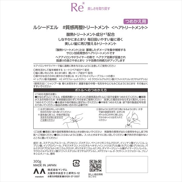 ■【説明】:サロン技術発想の酸熱トリートメント成分配合!髪を補修し、扱いやすい髪に導く酸熱ケアトリートメント。