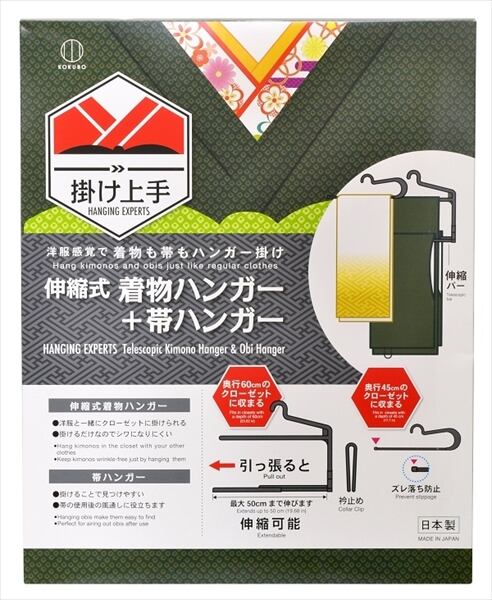 ■【説明】:洋服と一緒にクローゼットに掛けられる。掛けるだけなのでシワになりにくい。掛けることで見つけやすい。帯の使用後の風通しに。洋服感覚で着物も帯もハンガー掛け。