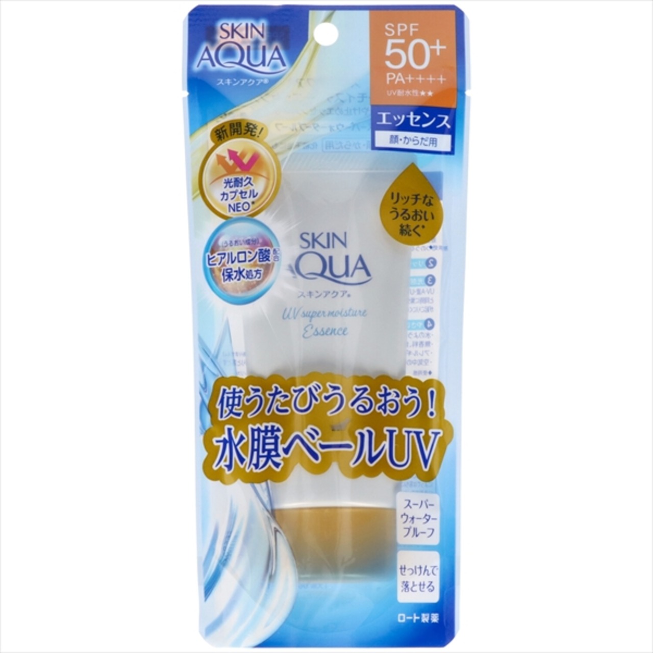 ■【説明】:リッチなうるおいの使用感続くエッセンスタイプの日やけ止め。ヒアルロン酸Naと超低分子ヒアルロン酸が肌表面と角層深くで保水し、肌吸着型ヒアルロン酸が肌表面にうるおいを留めます。無香料、無着色、鉱物油フリー、パラベンフリー。水に強いスーパーウォータープルーフ。石けんで落とせます。顔・からだ用で、化粧下地にもオススメです。たっぷり使える80g。SPF50+/PA++++/ UV耐水性★★。