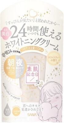 ■【説明】:24時間いつでも使える美白フェイクヌードクリーム。トラネキサム酸配合。朝は化粧下地に、夜は美白ケアとして。素肌になじんでほんのりトーンアップ(※1)するヌードホワイト。ホワイトティーの香り。[販売名:サナ 素肌記念日 薬用美白 フェイクヌードクリーム ホワイトティーの香り] (※1:メイク効果による)