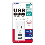 ■【説明】:コンセントとUSBの複合型タップ。コンセント2個口とUSBポート2個口付きSIAA抗菌加工を施し菌の繁殖を抑制します。